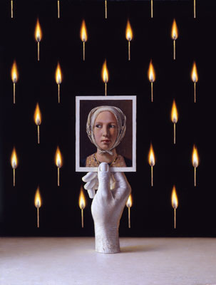 THE THIEF In The Thief, my subject matter includes the face of a young gypsy woman in Georges De La Tour's The Fortune Teller. She is trying to steal the watch of a prosperous-looking man who is being distracted by an old fortune teller. I have included her enigmatic face in several paintings over the years, because her expression really fascinates me. De La Tour was a French artist from the 1500's who was extraordinary in his ability to portray candle light in his paintings. I set my gypsy girl against a dark background which has may floating, lit matched that she is eyeing surreptitiously, as my way of honoring his mastery of candle light. Return to Icon Series home page |